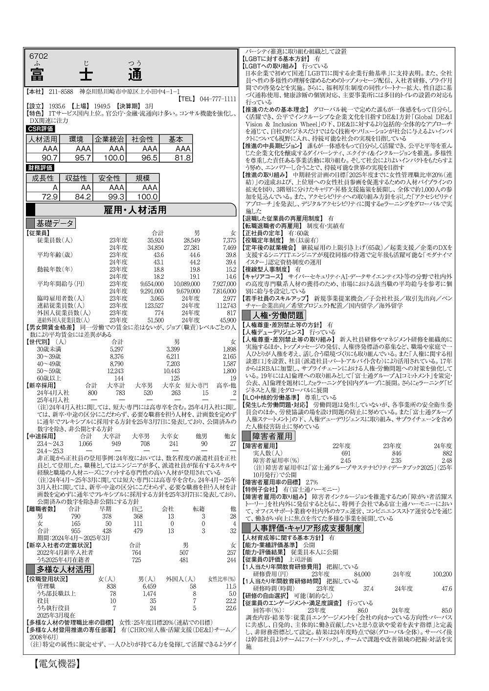 従業員数、平均年齢、勤続年数、平均年間給与、臨時雇用者数、連結従業員数、単体および連結の外国人従業員数、男女間賃金格差、世代別従業員数、新卒・中途採用人数、非正規から正社員への登用事例、離職者数、新卒入社者の定着状況