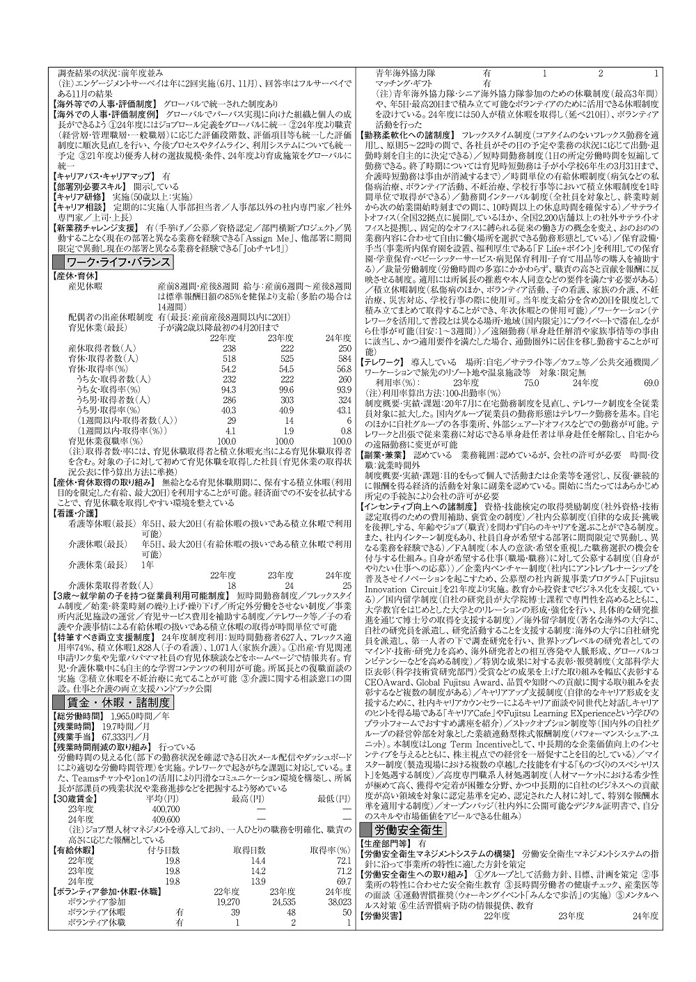 総労働時間、残業時間、残業手当、残業時間削減の取り組み、30歳賃金、有給休暇付与日数と取得状況、ボランティア参加・休暇・休職制度と利用状況、勤務柔軟化への諸制度、テレワーク、副業・兼業、インセンティブ向上への諸制度