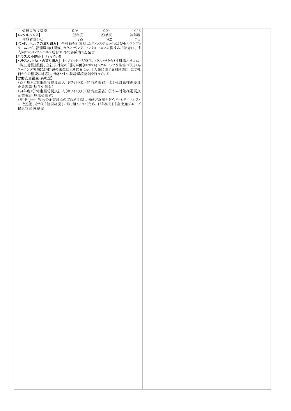 生産部門等の有無、労働安全衛生マネジメントシステムの構築、労働安全衛生への取り組み、労働災害度数率、メンタルヘルス休職者数、メンタルヘルス対策の取り組み、ハラスメント防止の取り組み、労働安全衛生・表彰歴