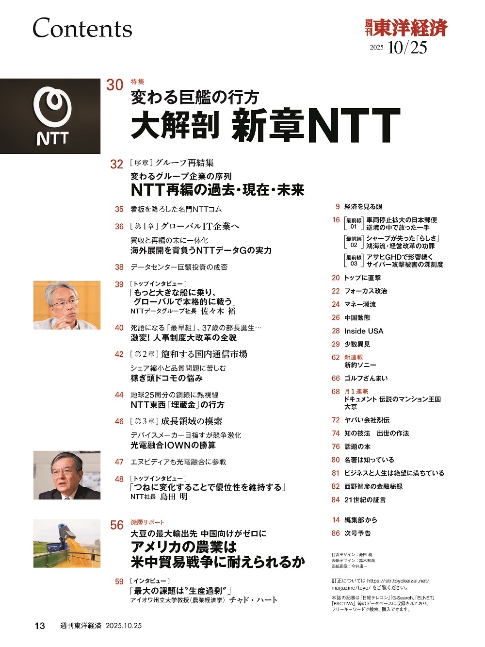 特集では、グループ体制や人事制度の構造改革、成長領域グローバルの将来像、成熟期を迎えた国内通信市場の今、次世代通信基盤「IOWN(アイオン)」の可能性など、さまざまな切り口で巨大グループの実像をひもときました。NTTデータグループ、NTTドコモ、NTT東日本・西日本、NTTコミュニケーションズ(現NTTドコモビジネス)と各主力会社の視点を網羅した点も特徴です。