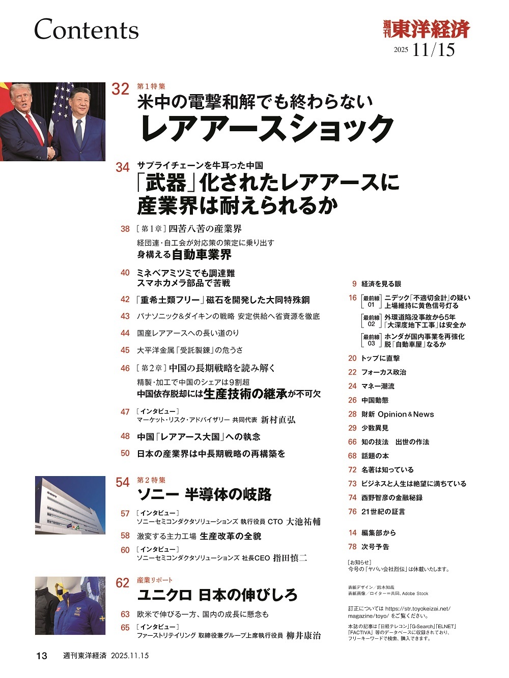 アメリカと中国の首脳会談を経て、「レアアースショック」の緊張は和らぎましたが、不安は消えません。中国はいつでも輸出規制に踏み出す可能性があるからです。サプライチェーンリスクが増す中、産業界はどう対応するのか? 特集ではレアアース調達の現状から企業の対応策までを網羅。中国依存脱却のポイントを解説していきます。第2特集は「ソニー半導体の岐路」、産業リポートは、ユニホーム事業に本格参戦した「ユニクロ 日本の伸びびしろ」を掲載します。