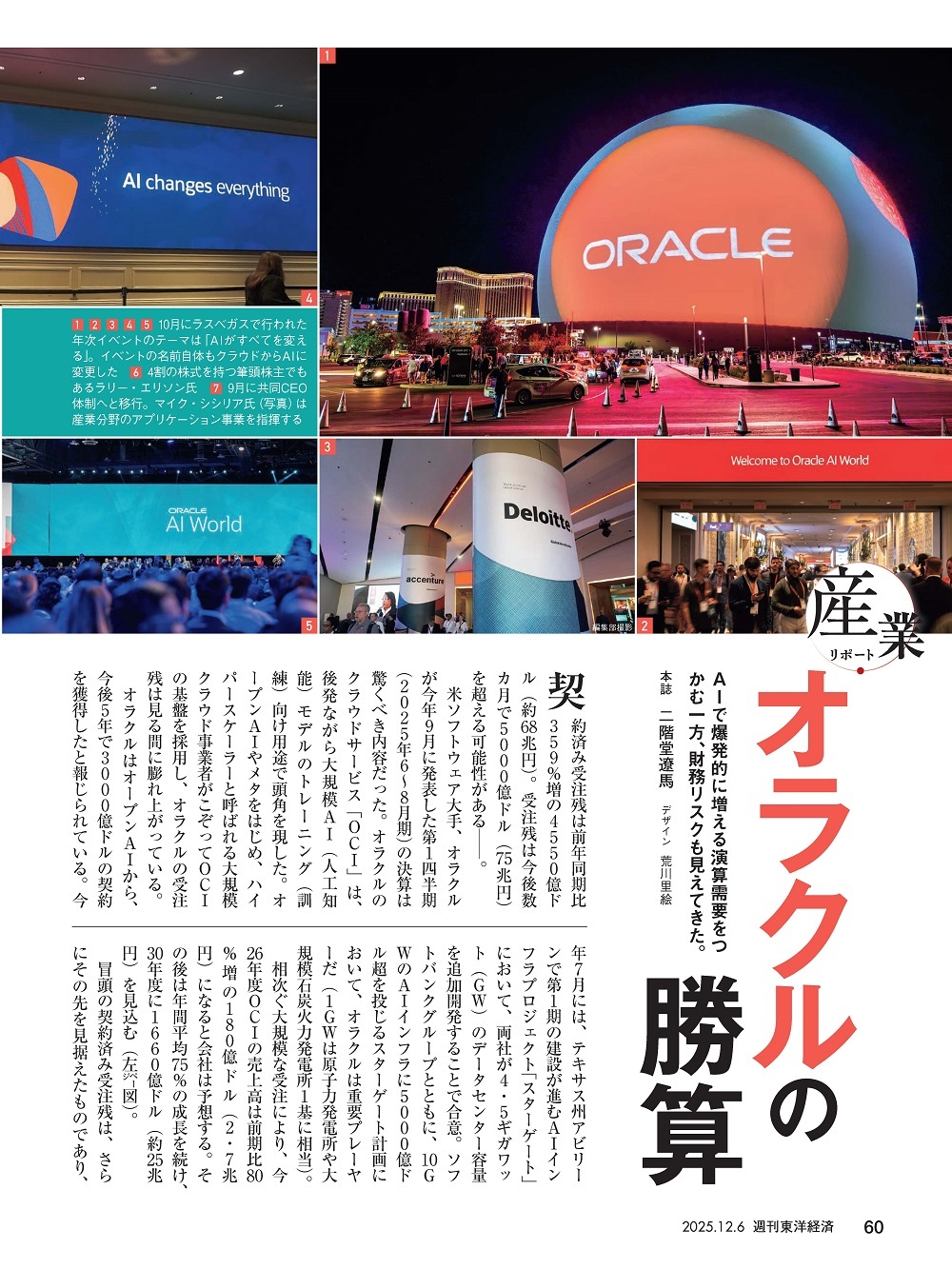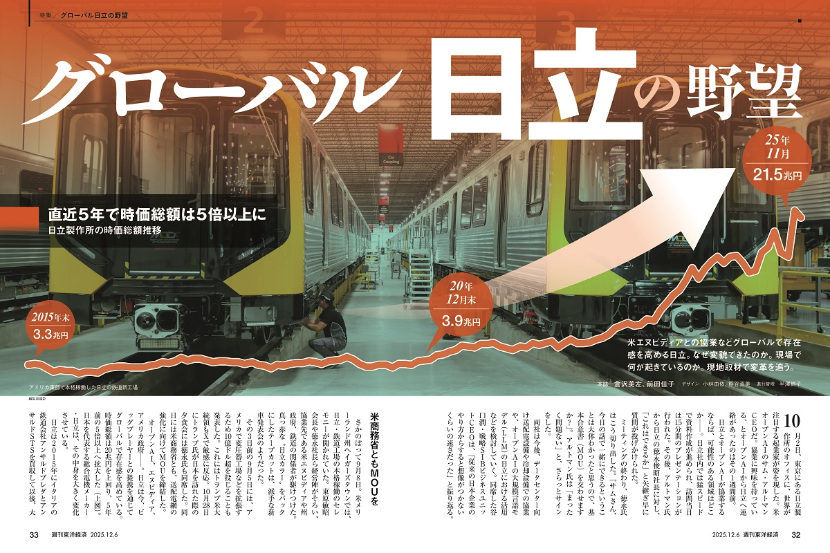 時価総額が直近5年で5倍以上に拡大した日立製作所。エヌビディアとの協業でインフラ向け保守・管理ソリューション「HMAX」を開発、オープンAIともデータセンターを軸とした提携を発表するなど、グローバルで存在感を高めています。なぜ変貌することができたのでしょうか。鉄道や送配電といった事業戦略から、営業改革、人材育成まで、現場で起きている変革を、海外取材を含めてリポートします。産業リポートは「オラクルの勝算」と「沸騰!医薬品CDMO富士フイルムの大勝負」を掲載しています。
