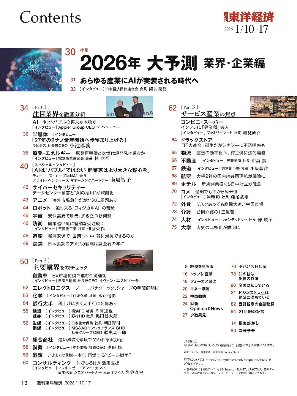 高市政権の政策、いわば「国策」も、2026年を読み解くうえで重要なキーワードです。防衛費の増額を背景に、防衛に加えて宇宙や造船といった関連分野でも官民投資の拡充が見込まれ、国内産業には強い追い風が吹いています。誌面ではさらに、自動車、食品スーパー、ドラッグストア、地銀などで進みつつある再編の動きにも目を向けました。人口減少やコスト上昇、技術革新といった構造変化が、業界の枠組みそのものを揺さぶり始めています。